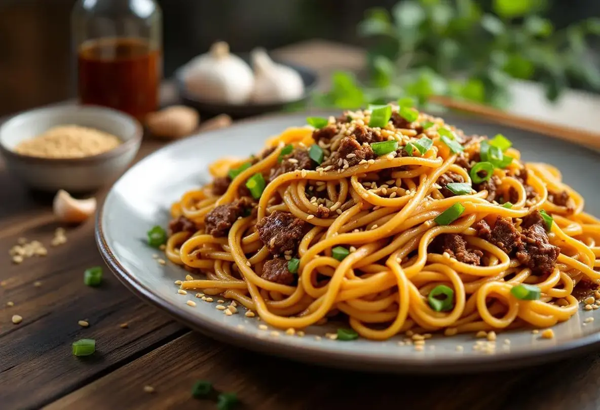 Le principe est simple. On prépare des pâtes, on fait revenir du bœuf haché avec de l’ail et du gingembre. On ajoute une sauce rapide à base de sauce soya, de vinaigre de riz et de bouillon. Puis on finit avec des oignons verts et du sésame grillé. Le résultat est gourmand, légèrement sucré-salé, et très parfumé.